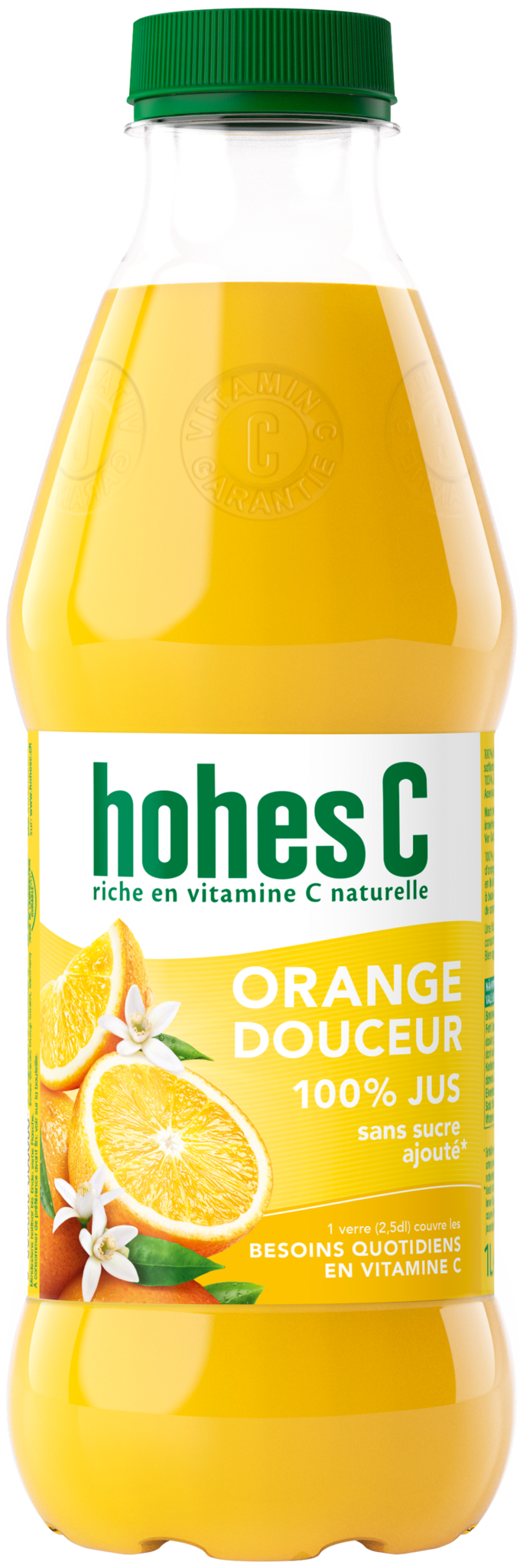 Parce que nous souhaitons te donner le meilleur pour bien commencer la journée, nous sélectionnons soigneusement des variétés d'oranges naturellement moins acides pour notre jus hohes C Orange Douceur. Un jus doux pour toute la famille. 1 verre (2,5dl) couvre les besoins quotidiens en vitamine C.